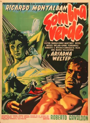 • This is an original, linen-backed, Mexican movie poster from 1957 for Mexican action thriller El Tesoro de Pancho Villa ("The Treasure of Pancho Villa") starring Fernando Oses, Alicia Caro, Rodolfo Landa, Pascual Garcia Pena, Carlos Muzquiz, Guillermo Hernandez, and Rafael Banquells.  Rafael Baledon directed the film as part of the Avenging Shadow (La Sombra Vengadora) masked avenger series.   Francisco Diaz Moffitt is the artist for the poster.