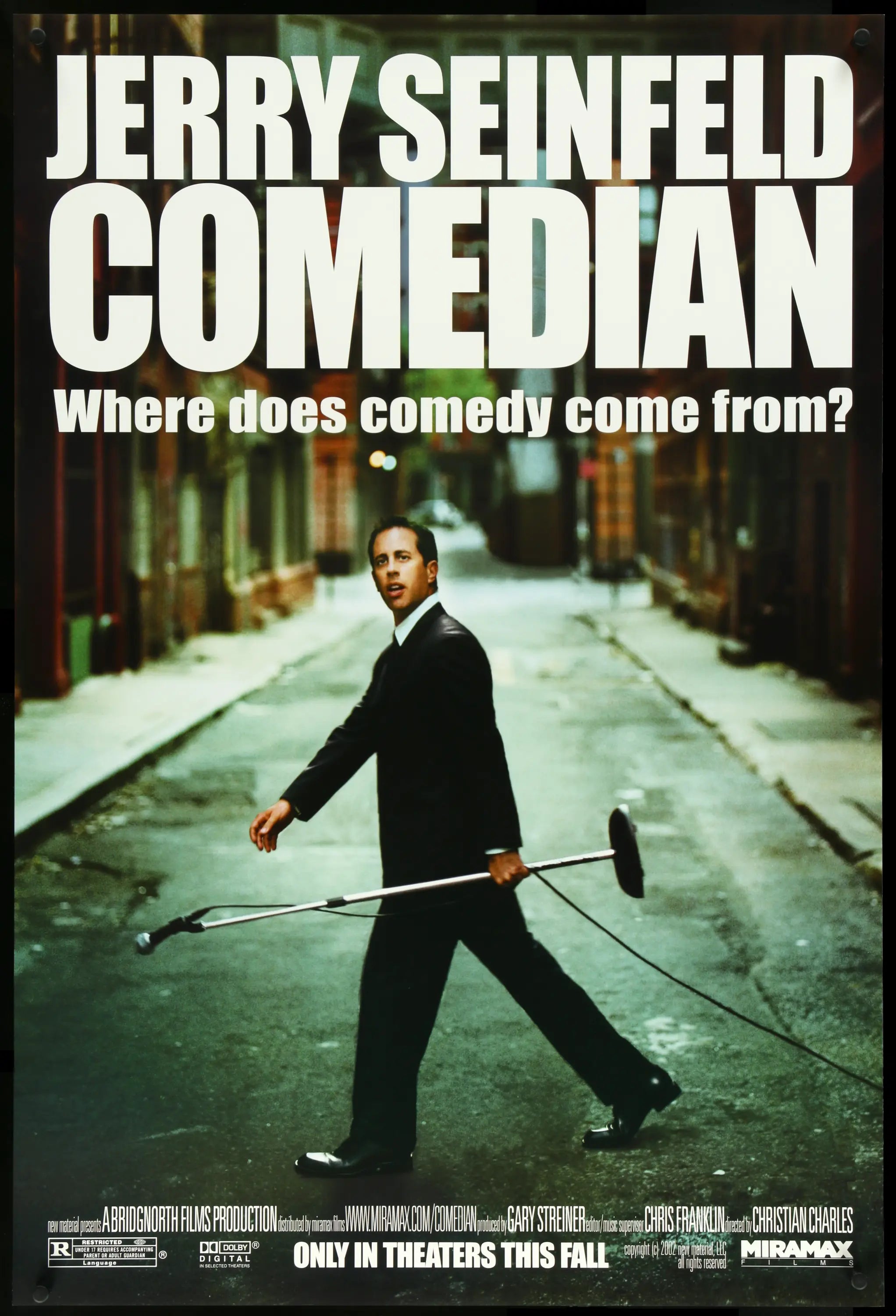 • This is an original, rolled, one-sheet movie poster from 2002 for Comedian with Jerry Seinfeld, Greg Giraldo, Sherrod Small, Colin Quinn, Chris Rock, and Jay Leno. Christian Charles directed the stand-up comedy documentary.