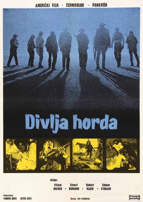 这是 1969 年由 William Holden、Ernest Borgnine、Robert Ryan、Edmond O'Brien、Warren Oates、Jaime Sanchez 和 Ben Johnson 主演的原创电影海报。山姆·佩金帕 (Sam Peckinpah) 执导了这部经典西部片。